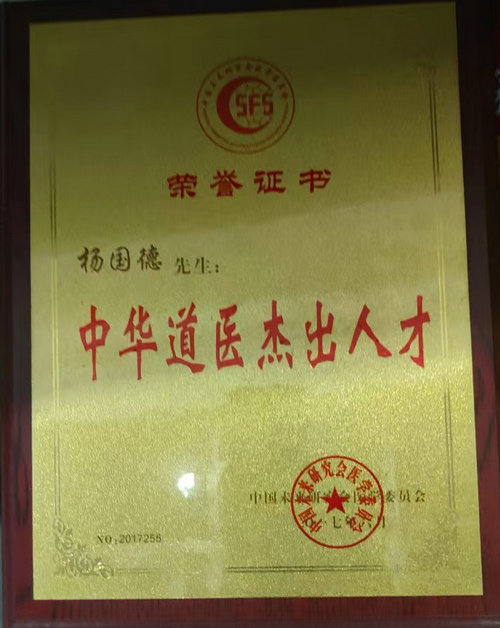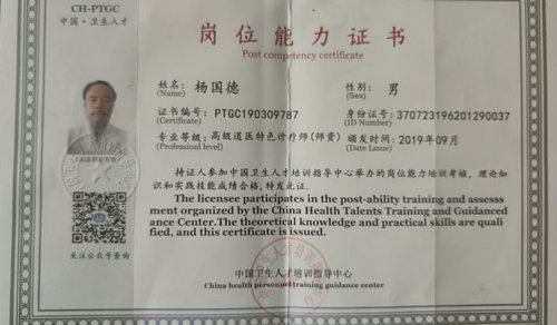 2O19年被卫生人才专业技术认证协会评为高级道医特色诊疗师。