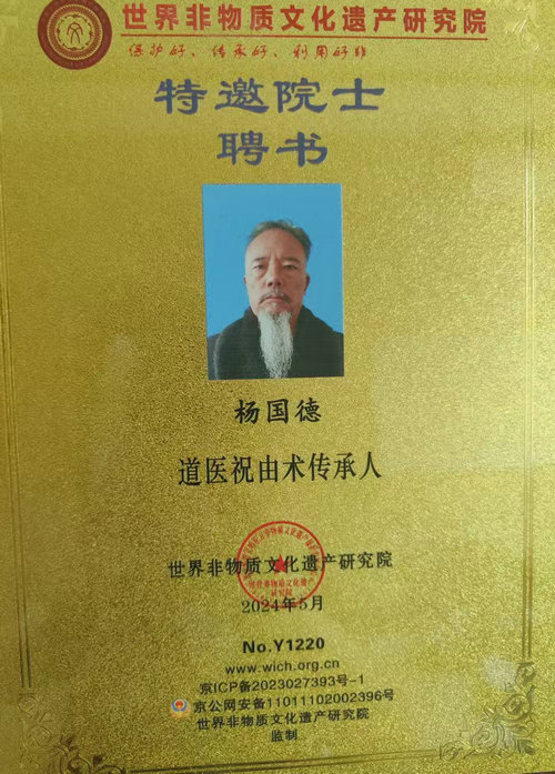 2024年被聘为世界非物质文化遗产研究院特邀院士、中国医药教育协会,道医心理咨询师、国医楷模。
