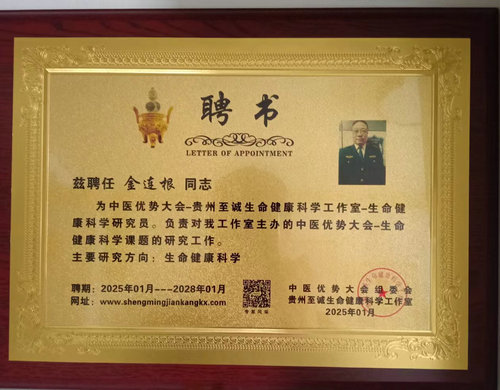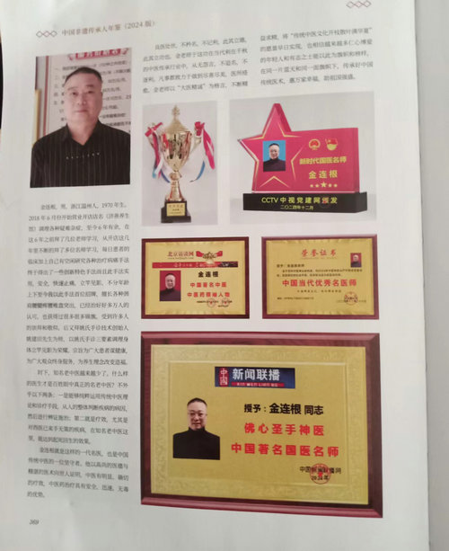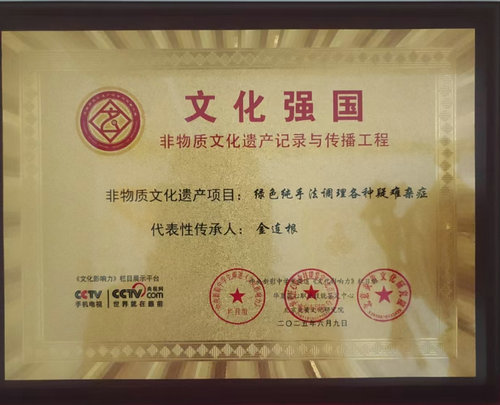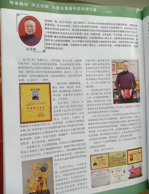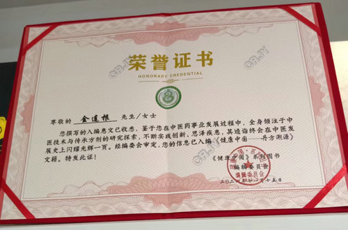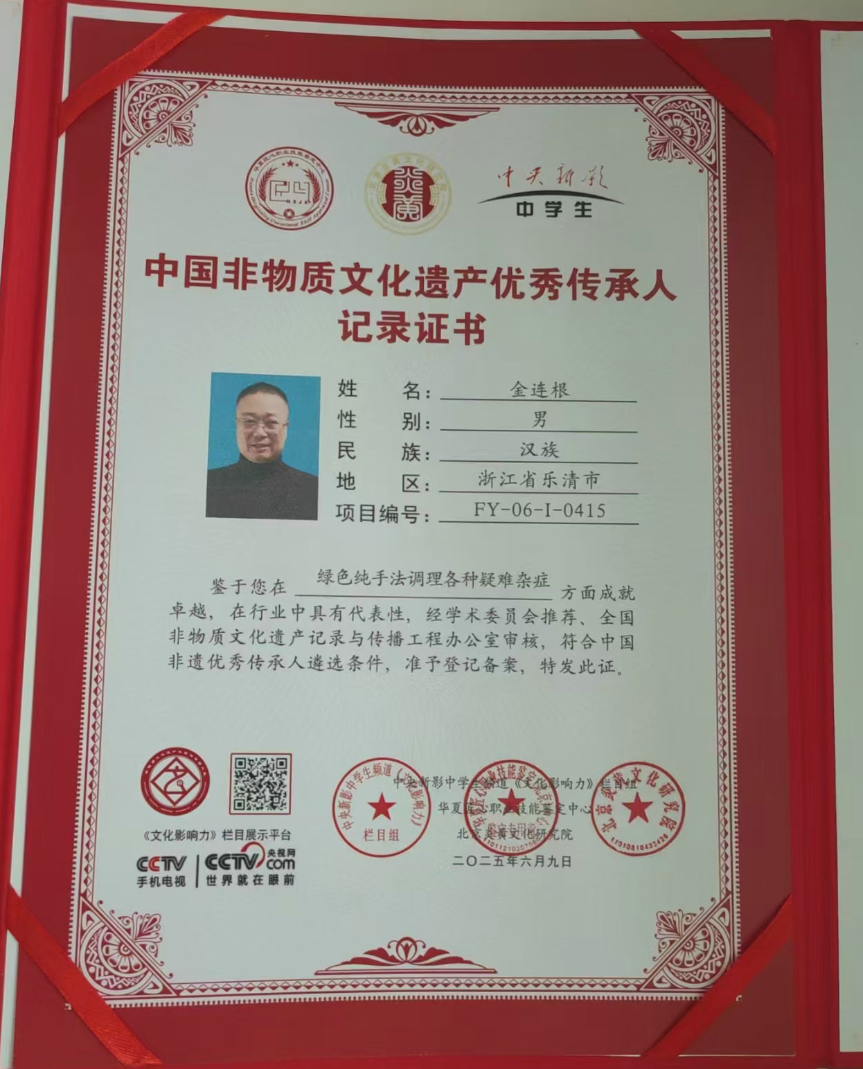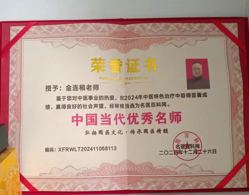 金连根在中医领域默默深耕数十载,以如磐初心坚守高尚医德,不仅是传统中医的坚定守望者,更是薪火相传的传承者。虽然获得了较大成功,仍然始终保持着对医术的敬畏和追求,以大医精诚为格言,志存高远,不断精益求精,特别注重自身医术技能的拓展提升,参加了多个国家级顶级专业研修研讨班的学习,汲取不同流派的中医精华,以大国名医的身份,谦虚谨慎,拜名师、求创新,融汇贯通,独创了一整套自已独有的安全实用高效的诊疗技能和独特手法,荣获多项中医中药界国家级的高端鉴定认可,荣膺多项桂冠。