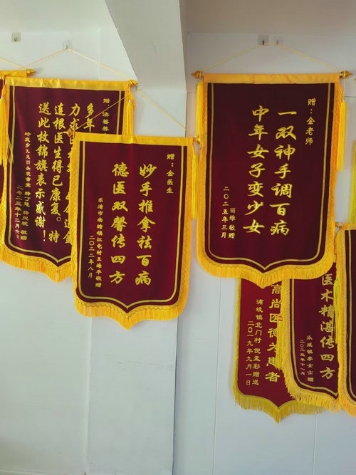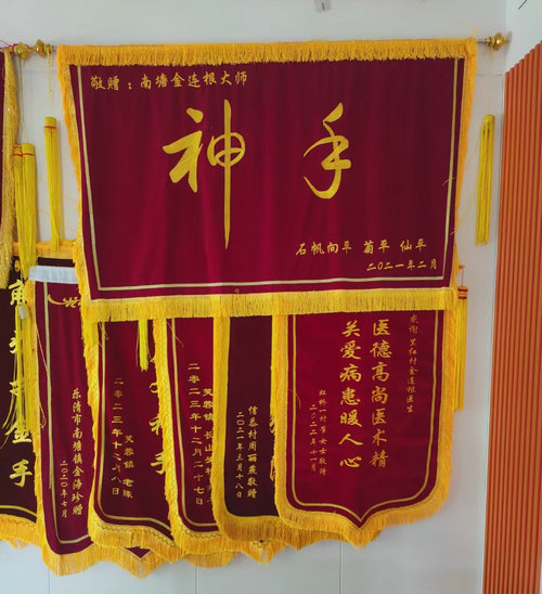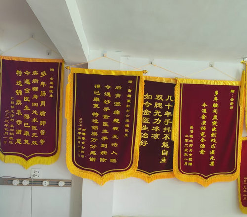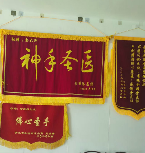 金连根良医处世,不矜名,不记利,此其立德,此其立功也。金连根于这功在当代,利在千秋的中医传承行业中,不忘初心牢记使命,凡事都致力于做到尽善尽美,医所痊愈,以大医精诚为格言,不断精益求精,将传统中医文化开枝散叶满华夏,在同一片蓝天和同一面旗帜下,传承好中国传统医术,惠万家幸福,助祖国强盛。金杯银杯,不如老百姓的口碑。治愈患者的口口相传,引来了众多的求医者,就连外省外市的患者都慕名前来求诊,让金连根应接不暇,为了让患者尽早尽快康复减轻痛苦,他经常起早摸黑,三餐不整,疲惫不堪。患者康复后的笑脸,才是金连根的所愿所求。有付出就有收获,金连根仁心仁术,受到世人的礼敬和尊重,济善养生馆內挂满了患者送来的一面面锦旗牌匾,表达了患者对金连根精湛医术的认可和高尚医德的敬佩。 路漫漫其修远兮,吾将上下而求索,金连根这位从乐清大地上走出的一代名医,扎根基层,服务桑梓,用博爱精神,为中医传承,倾尽全力,用自已的辛勤劳动和过人智慧守护着人们的健康,传承着中华民族宝贵的中医药文化遗产。