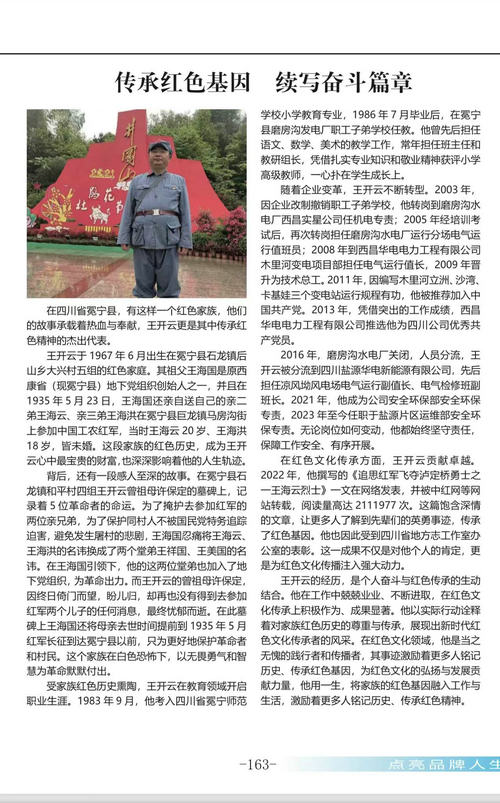 王开云的人生,是红色基因传承与个人奋斗交织的长卷。工作里的拼搏进取,文化传承中的积极作为,皆为对家族红色历史的敬畏与续写。他以行动诠释新时代红色传承者的使命,将家族红色基因融入日常,化作激励他人铭记历史、接续奋斗的精神火炬,让红色血脉在时代更迭中,愈发澎湃激昂 。