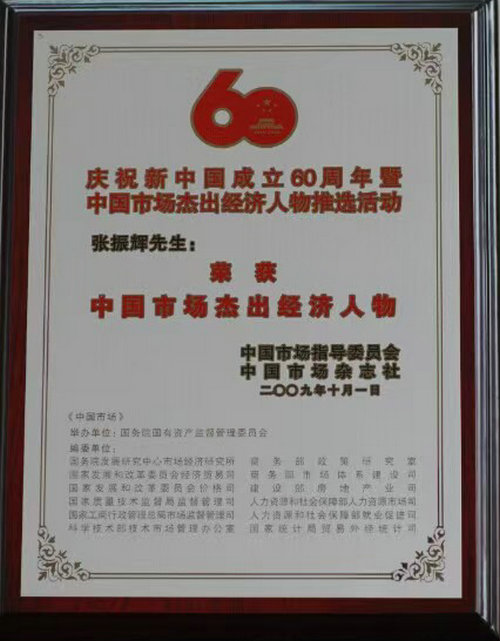 2009年10月在庆祝建国60周年由国家发改委、商务部、质检局、工商局等国务院十六部委联合开展的“辉煌60年暨中国市场杰出经济人物”推选活动中,被授予“中国市场杰出经济人物”荣誉称号。