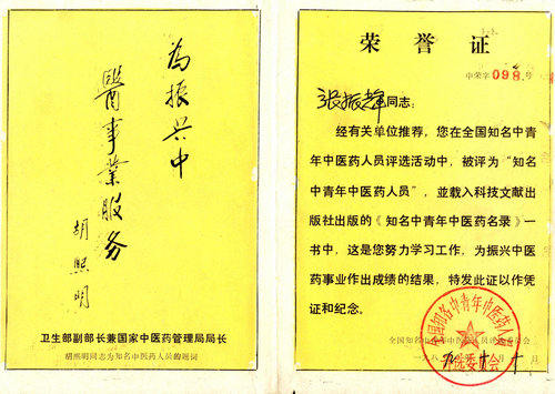 1989年被卫生部全国知名中青年中医药评选委员会评为“全国知名中青年中医药人员”。