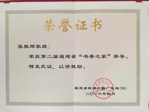 2016年4月荣获福建省新闻出版广电局“第二届福建省”书香之家”称号”。