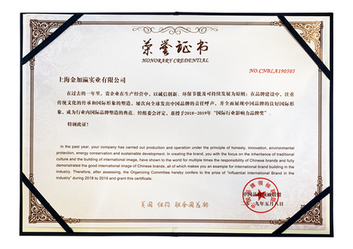 2019年5月金加瀛公司在联合国获颁“国际行业影响力品牌奖”。