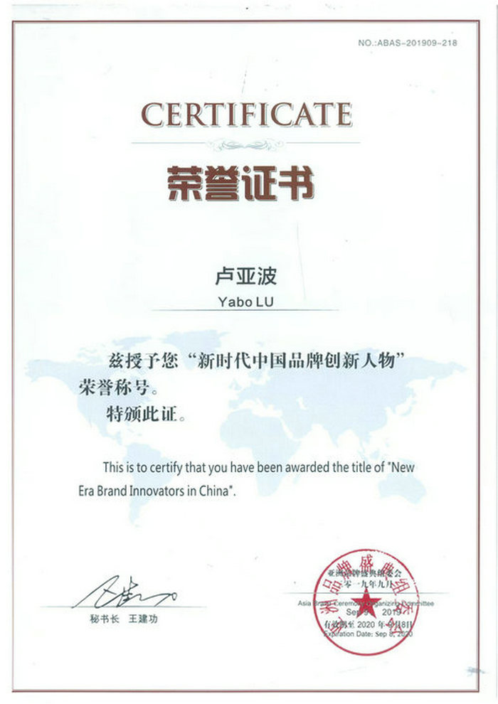 卢亚波董事长被评为“新时代中国品牌创新人物”,10月中国质量先锋网“质量先锋产品”。