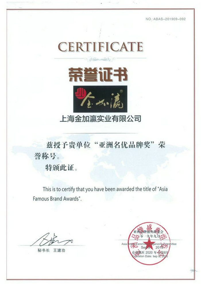 2019年9月9日获颁“亚洲名优品牌奖”。
