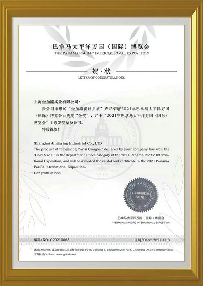 2020年3月15日至今先后被中国质量检验协会CAQI评为全国质量检验稳定合格产品、全国产品和服务质量诚信示范企业,全国床上用品行业质量领先品牌,全国消费者质量信誉保障产品等荣誉称号。